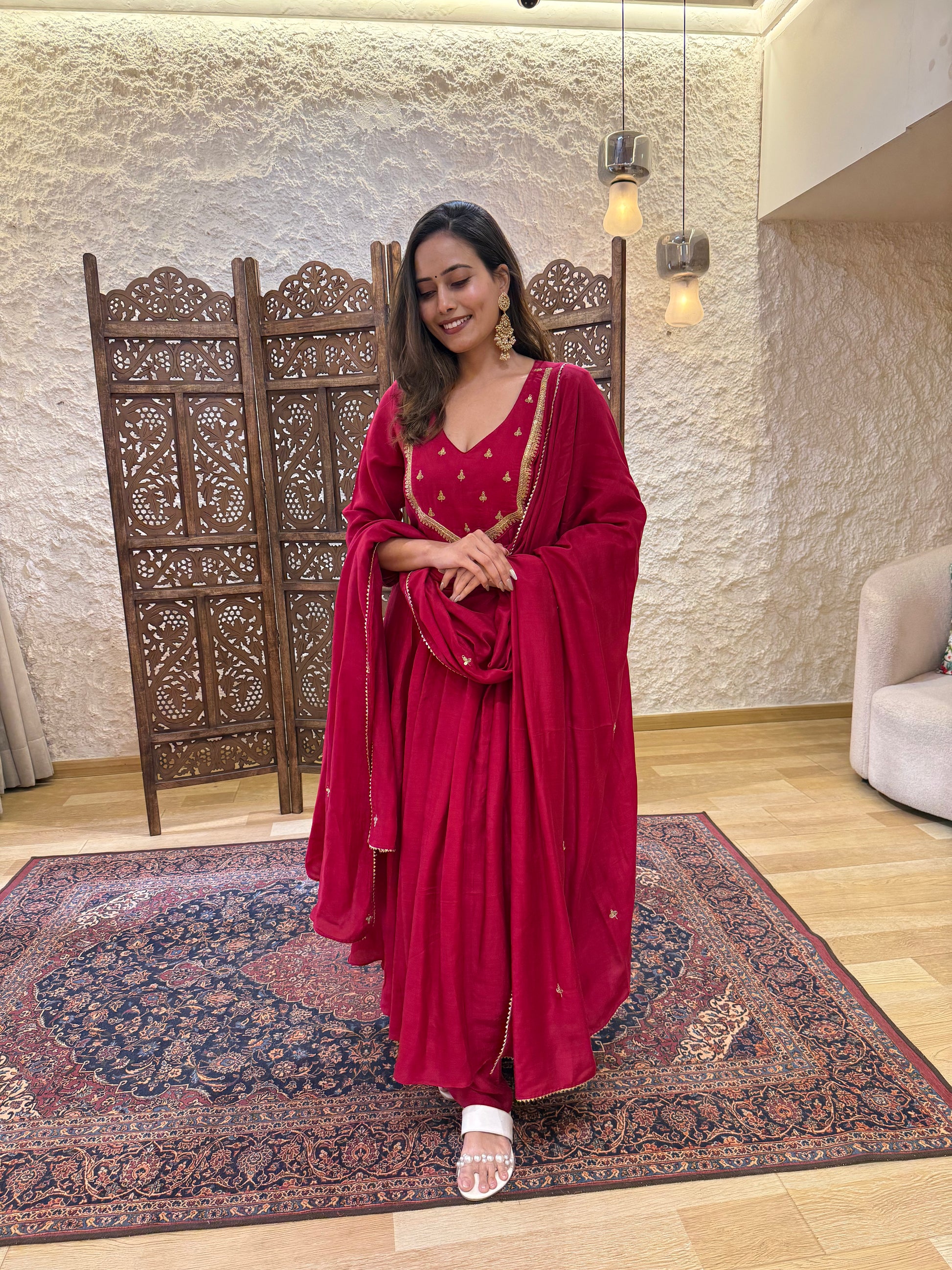 This Anarkali is made from soft muslin fabric with a comfortable mul lining inside, featuring handwork detailing on the neckline and sleeves, and paired with a matching tissue dupatta. The outfit is lightweight, easy to carry, and can be customised in four colours — White, Rani, Red, and Black.