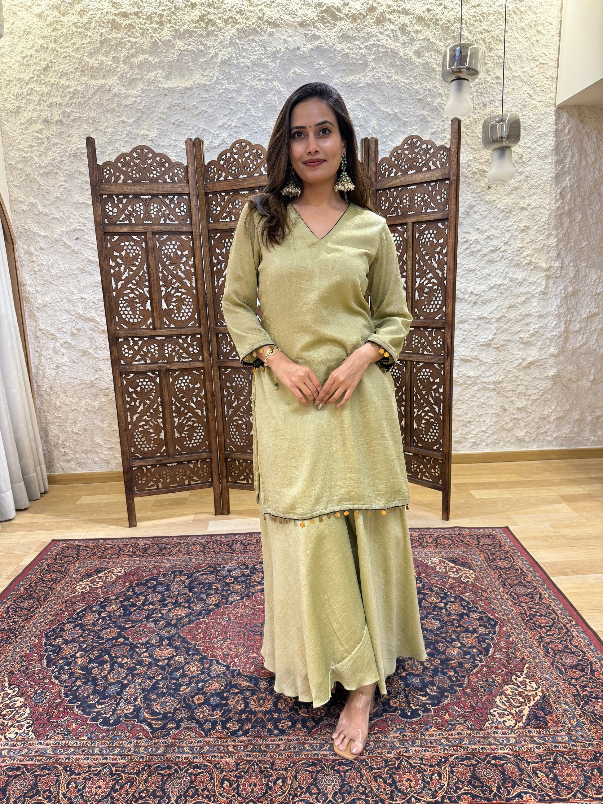 This Sharara set is made from tissue fabric with a soft mul lining for comfortable wear, and features coin detailing that adds a simple yet stylish touch. It is available in three colours — Wine, Black, and Rani.