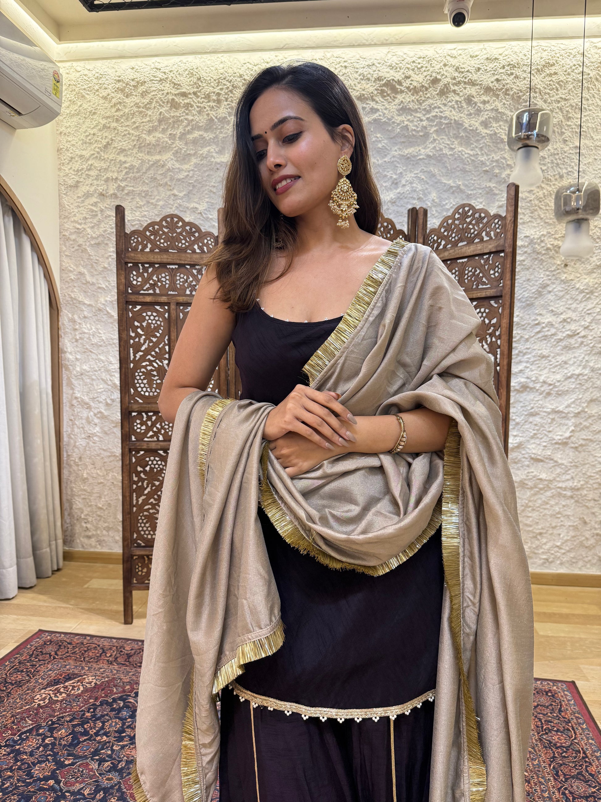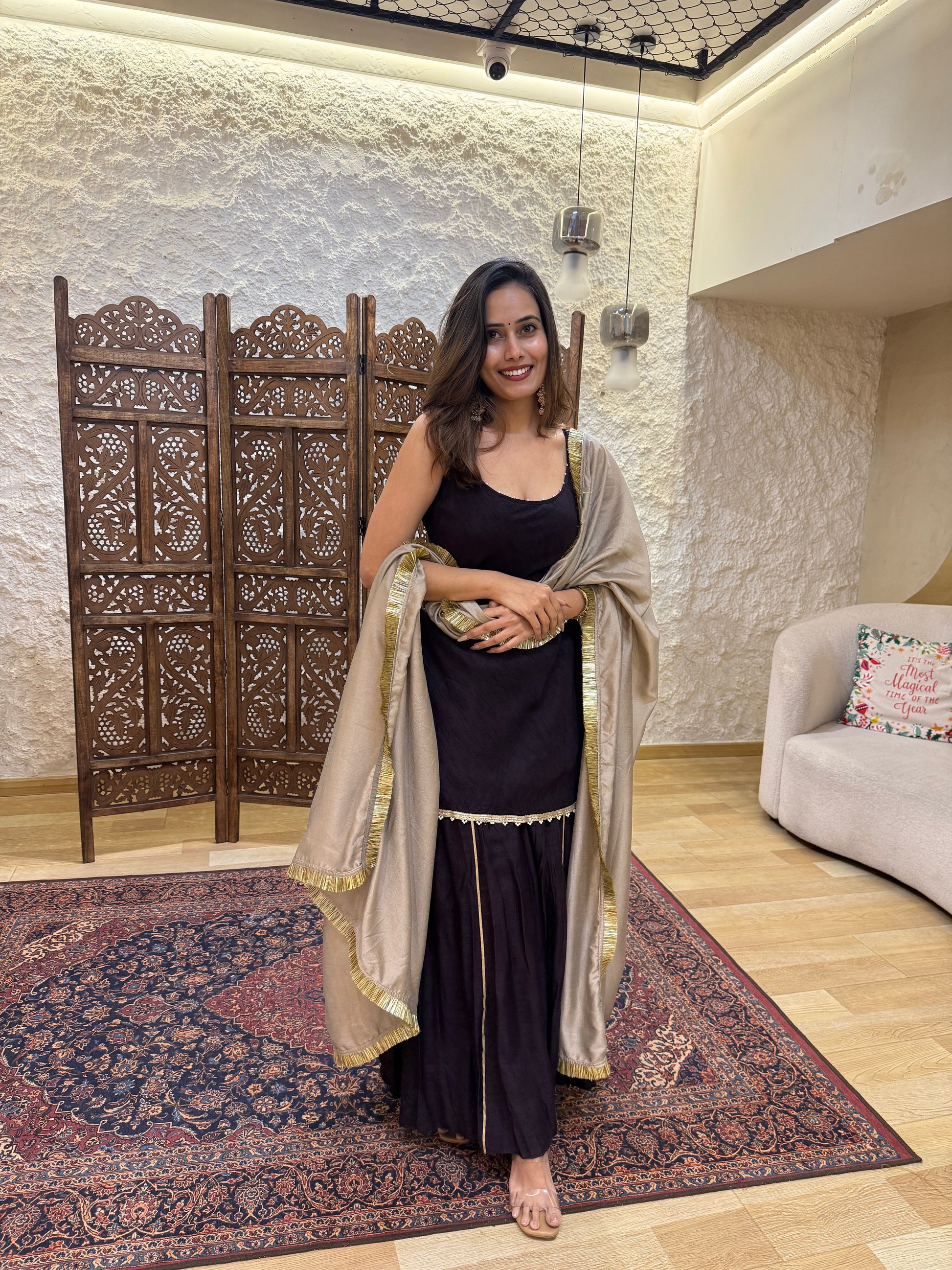 This Sharara set is made from dola silk with beautiful sequin work and comes with a matching tissue dupatta. It’s lightweight, festive, and perfect for Mehendi and pre-wedding functions, giving a bright and elegant look for your special events.